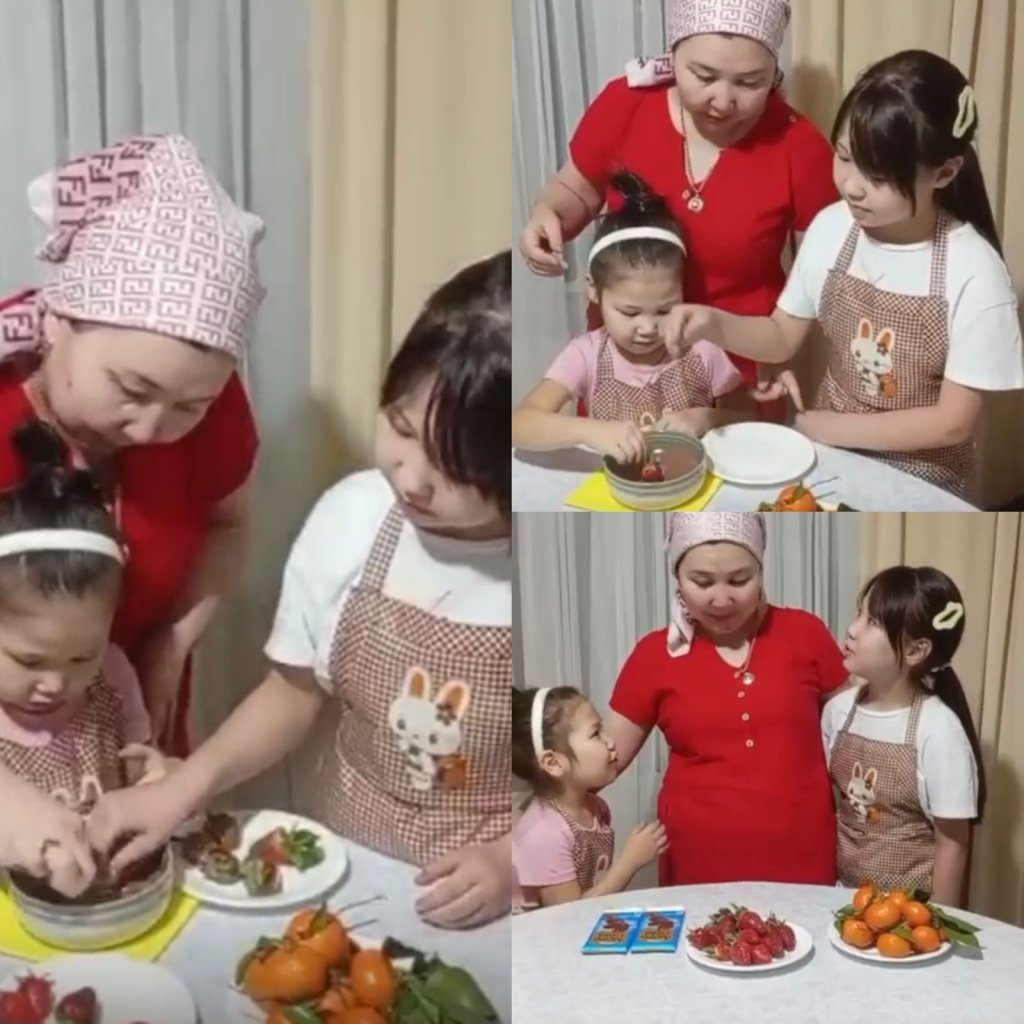 5-сынып оқушысы Жанбатыр Фатима анасы және сіңлісімен бірге тәтті дайындауда.