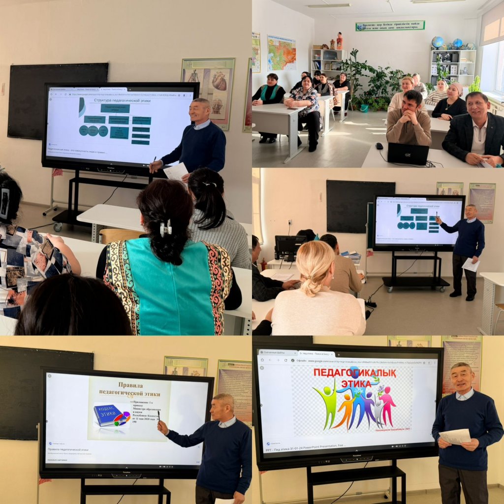 Мектеп мұғалімдері үшін педагогикалық этикаға арналған жиналыс өткізілді. Жиналыс барысында мұғалімнің кәсіби этикасы, қарым-қатынас мәдениеті және педагогикалық жауапкершілігі мәселелері талқыланды.