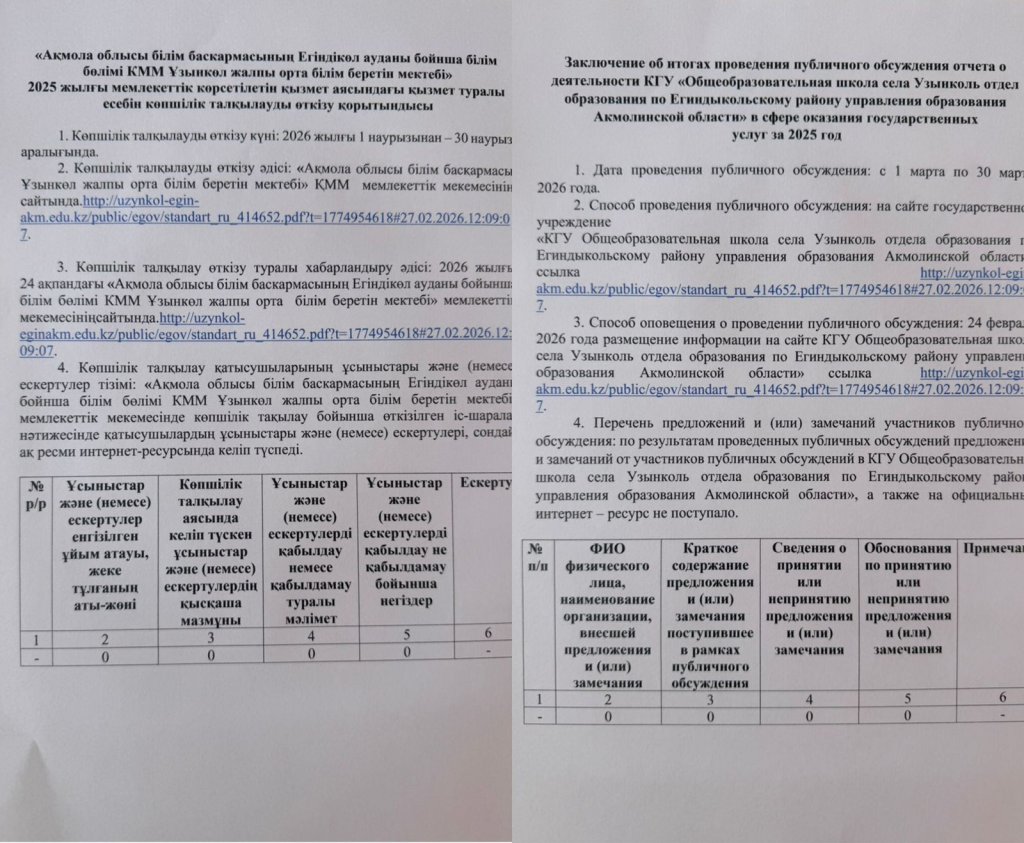 "Ақмола облысы білім басқармасының Егіндікөл ауданы бойынша білім бөлімі КММ Ұзынкөл жалпы орта білім беретін мектебі" 2025 жылғы мемлекеттік көрсетілетін қызмет аясындағы қызмет туралы есебін көпшілік талқылауды өткізу қорытындысы